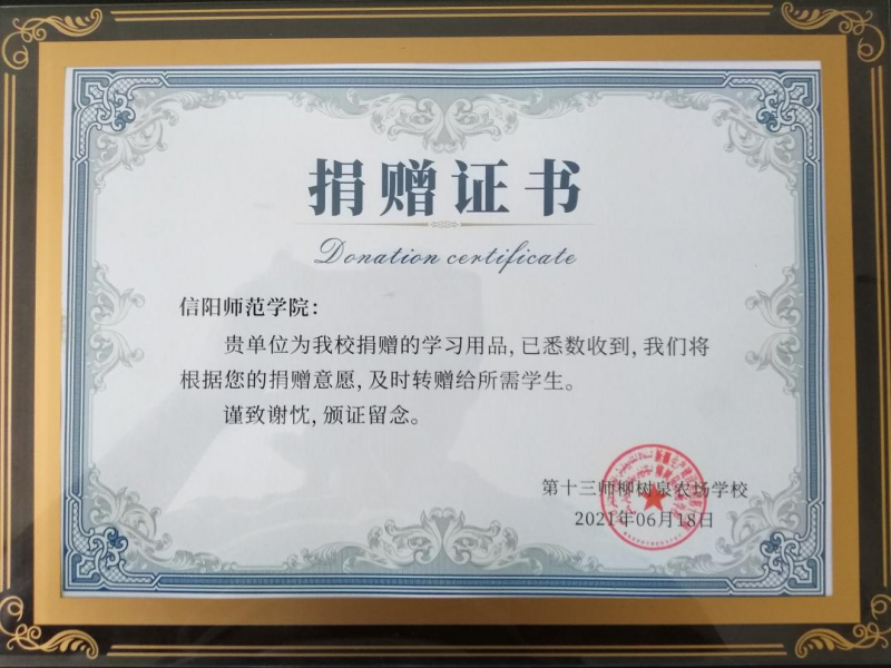 6月27日,信陽師範學院收到了來自新疆生產(chan) 建設兵團第十三師柳樹泉農(nong) 場學校熱依代·阿力木等學生的74封感謝信,其中一封信中這樣寫(xie) 道:“信陽師範學院給我們(men) 邊疆孩子送來了溫暖和關(guan) 愛,讓我們(men) 了解了信陽新縣——英雄山上的‘八麵紅旗’,學習(xi) 了許世友將軍(jun) 等革命先烈的故事,我們(men) 會(hui) 用贈予的畫筆、尺規描繪出最絢麗(li) 的世界,用文字書(shu) 寫(xie) 出最瑰麗(li) 的夢想,將最美的邊疆故事裝進書(shu) 包。我們(men) 永遠都記住了大別山革命老區‘信陽師範學院’這個(ge) 響亮的名字。”隨信寄來的還有信陽師範學院對柳樹泉農(nong) 場學校的捐贈證書(shu) 。