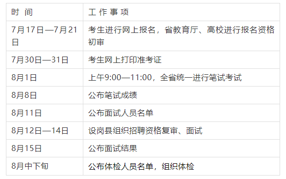 3.組織麵試。各地組織麵試時間為(wei) 8月12日—14日。麵試主要考察應聘者學科知識、教師基本素養(yang) 、語言表達能力、儀(yi) 表舉(ju) 止等,滿分為(wei) 100分。麵試工作由各設崗縣(市)或省轄市組織實施。