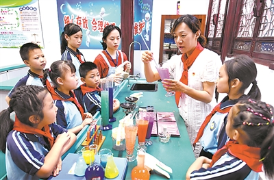 7月13日,安徽省安慶師範大學學生誌願者走進迎江區依澤小學,在科學實驗室裏與(yu) 孩子們(men) 一起體(ti) 驗科技的神奇。黃有安 王佳 攝