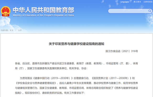 近日,教育部聯合國家衛生健康委等四部門印發《營養(yang) 與(yu) 健康學校建設指南》,對適應兒(er) 童青少年生長發育需要,推動學校營養(yang) 與(yu) 健康工作,規範學校營養(yang) 與(yu) 健康相關(guan) 管理行為(wei) 作出要求。