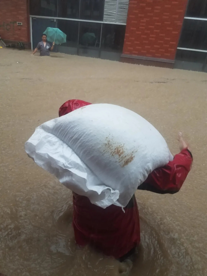 鄭州大學後勤人員背沙袋阻擋洪水(學校供圖)