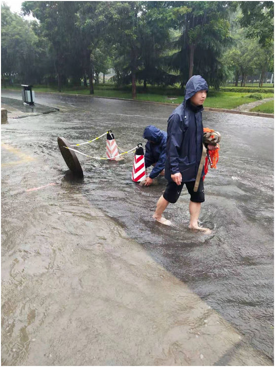 災情就是命令,險情就是戰場。自防汛救災工作開展以來,學校後勤處、保衛處、學工部等相關(guan) 部門發揚連續作戰精神,始終堅守在防汛一線,連夜冒雨搶險、排險,積極進行電力搶修、排水、管道疏通等相關(guan) 工作,努力做好河水漫灌入校的排放疏通、沙袋封堵防止配電設施進水等防汛救災應急舉(ju) 措,加強夜間巡查和人員值守,細致排查建築物安全隱患,科學設置警示標誌;雨後及時組織人員對公共場所打掃、消毒,全力以赴保障全校近3000名在校師生正常生活,截至7月23日,學校未出現斷水斷電斷網情況,超市、餐廳供應正常。