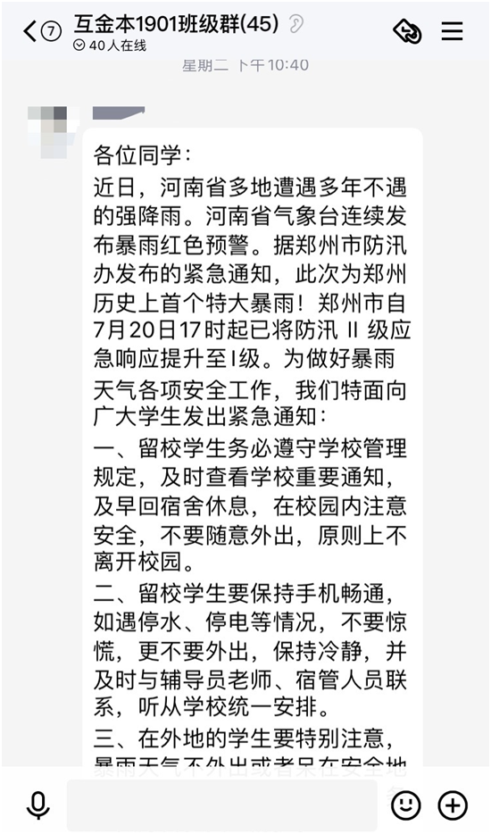 在災情發生的第一時間,鄭州工商學院全體(ti) 輔導員及相關(guan) 負責老師齊上崗,主動摸排,及時了解掌握受災較重地區學生的有關(guan) 情況,切實落實學校各項資助幫扶政策,幫助學生和家庭解決(jue) 實際困難。對暑期留校的學生,值班領導多次冒雨到場關(guan) 心慰問,各個(ge) 學院的老師、輔導員也紛紛行動起來,清理積水、運送物資、前來問候關(guan) 懷在校同學們(men) 的情況,一聲聲問候,一句句關(guan) 心,減輕了同學們(men) 離家萬(wan) 裏的擔憂。無法到校的老師也主動地全麵掌握學生地位置信息,了解實際情況和所需,為(wei) 他們(men) 提供力所能及的幫助。