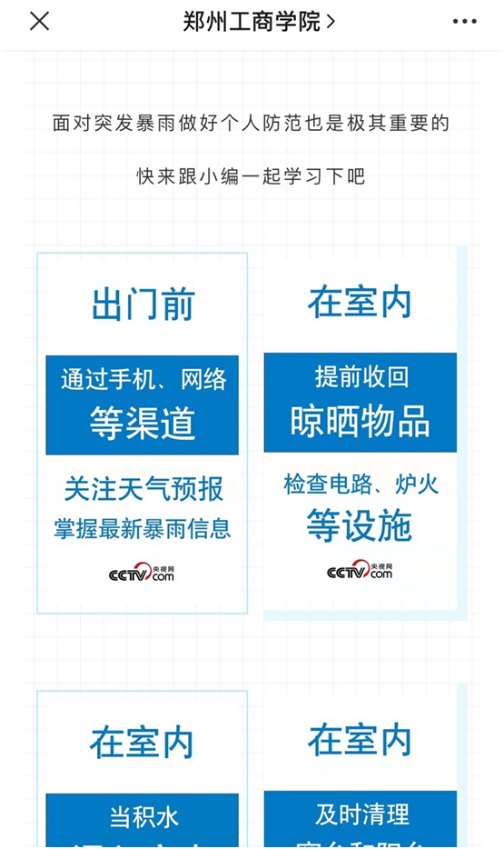 在暴雨來襲,汛情緊急的時刻,學校所有官方平台在線發聲,向社會(hui) 外界傳(chuan) 遞校園汛情信息和師生安全保障情況;向在外的鄭工商學子們(men) 傳(chuan) 遞避險的方法、求救救助的方式;向留校的學生們(men) 傳(chuan) 遞領導的關(guan) 心、後勤安保的聯係方式,安撫了他們(men) 焦慮的心情,讓家長放心。同時,在所有平台準時傳(chuan) 遞氣象信息,提醒工商學子做好防護;積極發布求助私信、救援電話,與(yu) 救援力量對接;主動承接網上救援工作,幫助受災群眾(zhong) 及時得到支援。