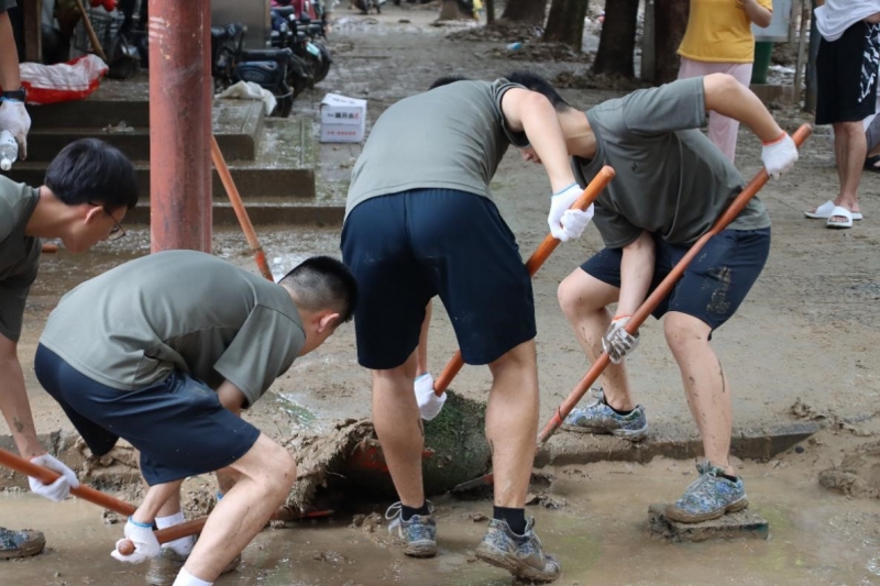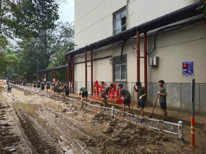 汗水濕透衣背。7月22日上午9時,在河南中醫藥大學武裝部、保衛處負責同誌和15名軍(jun) 訓教官的帶領下,85名軍(jun) 訓隊員抵達東(dong) 明路校區。他們(men) 根據現場情況,快速製定抗洪排水方案,進行了周密部署,並迅速投入清理道路泥土等抗洪排水工作。校區內(nei) 道路布滿淤泥、路麵大麵積被淹,泥漿和著雨水衝(chong) 出來的垃圾鋪滿路麵。同誌們(men) 不怕髒,不怕苦,士氣高昂,精神抖擻,齊心協力清淤泥,保暢通。食堂、宿舍樓、道路上,隨處都能看到大家揮灑汗水的身影。3個(ge) 小時過去了,在大家分秒必爭(zheng) 、全力奮戰下,東(dong) 明路校區積水清理完畢,路麵煥然一新,各場地整潔幹潔,解決(jue) 了困擾師生的校區大麵積被淹的困境。“軍(jun) 訓官兵、真是好樣的!現在的年輕人,真中!”現場不時發出感動、讚美聲。