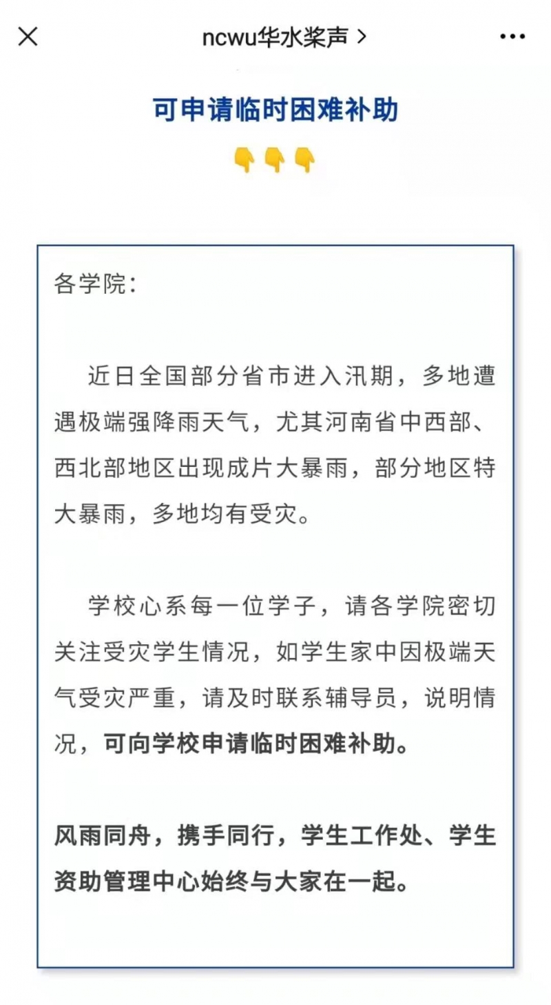 及時啟動困難補助。學生處心係每一位學子,第一時間開通學生資助通道,對受災學生給予資助。要求各學院輔導員密切關(guan) 注受災學生情況,如學生家中因極端天氣受災嚴(yan) 重,第一時間聯係並說明情況,學校將按照一定標準發放臨(lin) 時困難補助。研究生院針對留校、公派外出研究生數量和所在位置(城市),有無受災和意外情況發生等情況的統計工作,並製定和推動落實相關(guan) 救助措施。
