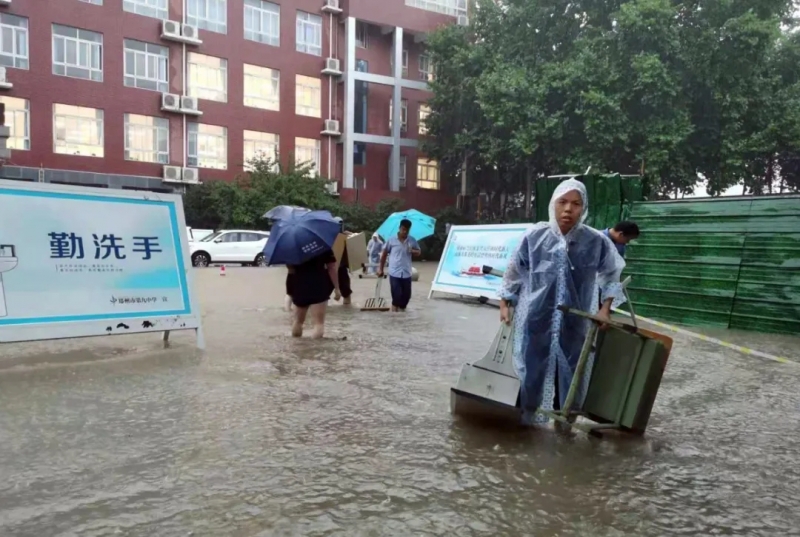 20日,暴雨漫灌校園,情勢危急,鄭州市第九中學教職員工堅守防汛救災一線,搶救搬運物資設備,全力保障學校財產(chan) 安全。