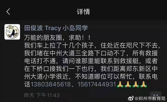 21日淩晨0點20分,看到該條求助信息後,鄭東(dong) 新區中州大道小學校長劉國增緊急部署,開展救助工作。