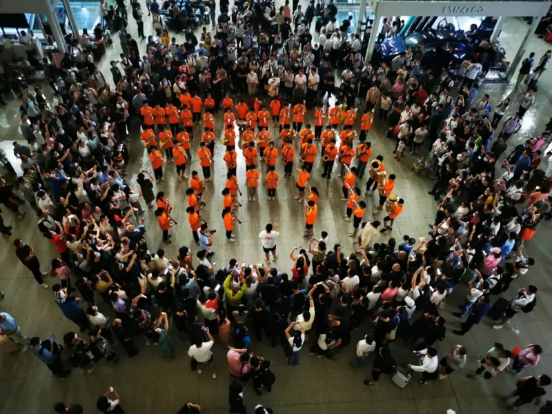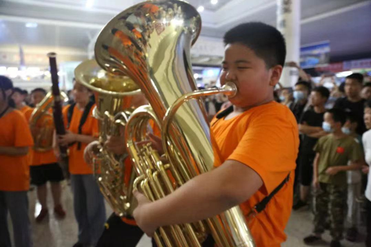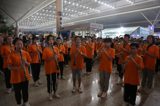 雨勢依舊不減,令人心情急躁。管樂(le) 團裏的一位老師建議道:“孩子們(men) ,讓我們(men) 拿起自己的樂(le) 器來為(wei) 滯留的旅客演奏吧!”學生迅速找好自己的位置,拿起樂(le) 器,在應急燈光下演奏《我和我的祖國》《傲氣衝(chong) 天》《威廉退爾序曲》……