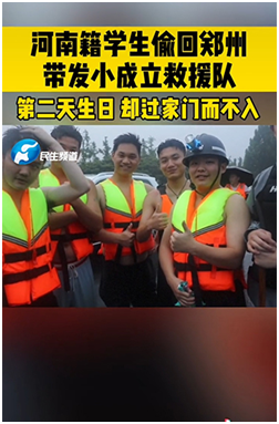 酒店管理專(zhuan) 科K2001班學生金益源,於(yu) 7月21日晚和幾位朋友一起組織在龍子湖附近做誌願者,在惡劣的暴雨情況下,積極前往水漫最嚴(yan) 重的道路段連續幹了兩(liang) 夜。他今年準備參軍(jun) 入伍,感覺這是自己應該做的事。7月22日是金益源20歲的生日,他說,“這是送給自己成長最好的禮物,相信國家一定可以戰勝一切困難,相信河南一定能盡快重建美好家園。”