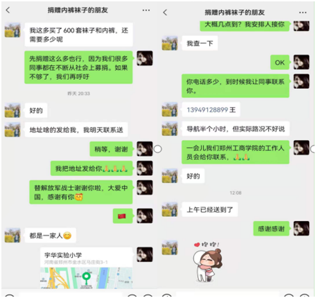 工學院土木工程係教師尚亞(ya) 瓊看到學校為(wei) 在鄭州校區休整的1000多名救災官兵征集換洗內(nei) 褲和襪子的通知後,也緊急在家籌集襪子等相關(guan) 物資幾百雙,之後不顧自身安危,涉水返回學校,將籌集物資親(qin) 自交到學校。尚老師說:“與(yu) 奮戰在抗洪一線的人民子弟兵們(men) 相比,我能做的這些都微不足道,能盡自己的一份力量,讓他們(men) 感受到河南人民溫暖,就足夠了。”