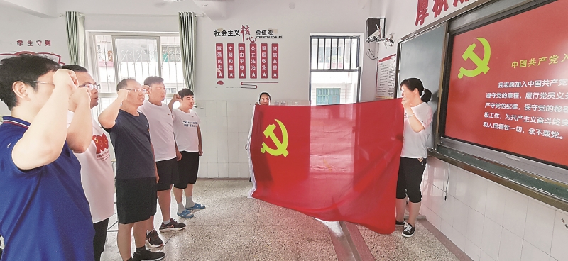 “各位父老鄉(xiang) 親(qin) ,凡是在這兒(er) 的共產(chan) 黨(dang) 員、共青團員全部站到前麵來!咱要成立一個(ge) 臨(lin) 時黨(dang) 支部!”升旗儀(yi) 式上,衛輝市汲水鎮徐莊社區黨(dang) 支部副書(shu) 記趙虎向現場群眾(zhong) 發出號召,“黨(dang) 員、團員在關(guan) 鍵時刻衝(chong) 得上去、危難關(guan) 頭豁得出來。”經過現場報名和統計,安置群眾(zhong) 中的12名黨(dang) 員和6名共青團員主動站了出來,在學校黨(dang) 委的組織下,成立了中共新鄉(xiang) 市第一中學委員會(hui) 第11黨(dang) 支部。
