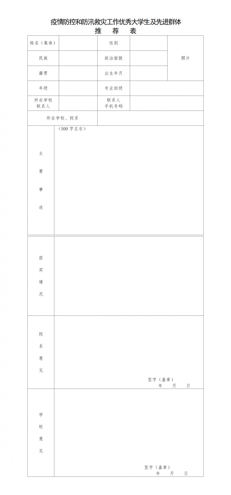 附件:疫情防控和防汛救災工作優(you) 秀大學生及先進群體(ti) 推薦表