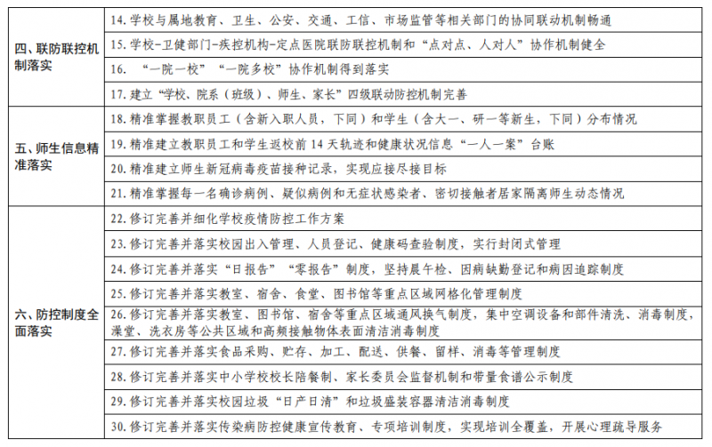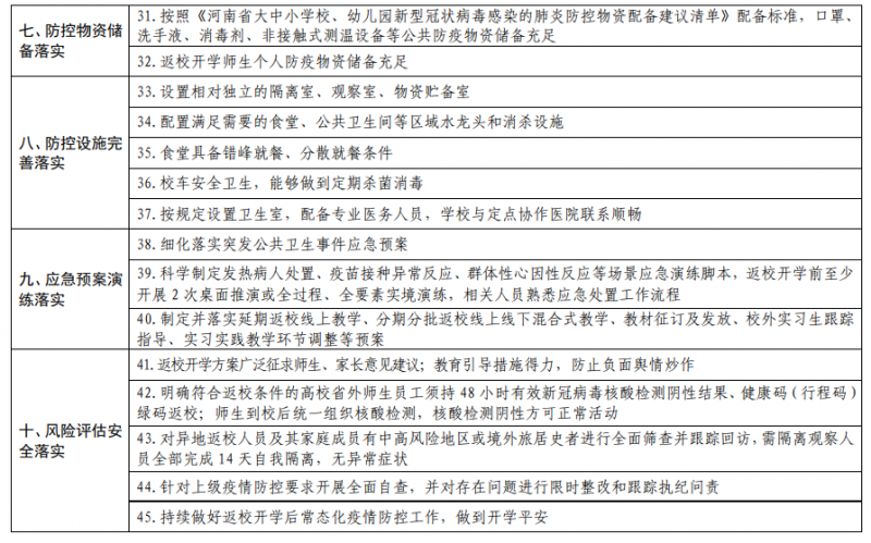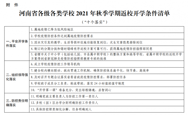 為(wei) 穩妥推動全省各級各類學校返校開學,確保開學前後教職工和學生身體(ti) 健康、校園安全和教育教學秩序,堅決(jue) 做到平安開學、開學平安,按照黨(dang) 中央國務院疫情防控決(jue) 策部署以及國務院應對新冠肺炎疫情聯防聯控機製綜合組《重點場所重點單位重點人群新冠肺炎疫情常態化防控相關(guan) 防護指南(2021年8月版)》、教育部關(guan) 於(yu) 2021年秋季學期開學事宜的相關(guan) 要求、教育部科學謀劃秋季學期學生返校開學三條底線標準和省委省政府新冠肺炎疫情防控工作部署,河南省新冠肺炎疫情防控指揮部教育係統工作專(zhuan) 班辦公室研究製定了《河南省各級各類學校2021年秋季學期返校開學條件清單》,一起來看!