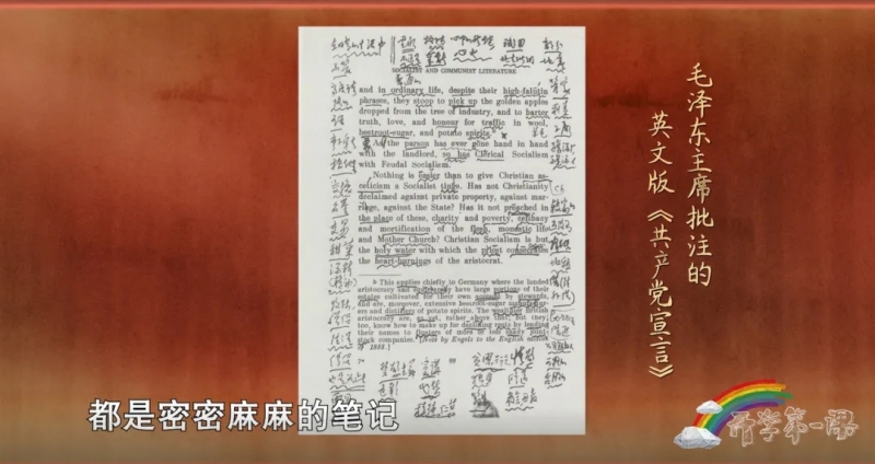 六十多歲的毛澤東(dong) 主席想學一些馬克思主義(yi) 經典著作的英文本,他第一本選的也是《共產(chan) 黨(dang) 宣言》。閱讀的時候,毛澤東(dong) 主席一邊思考一邊做著筆記,從(cong) 第一頁到最後一頁,都是他密密麻麻的批注。
