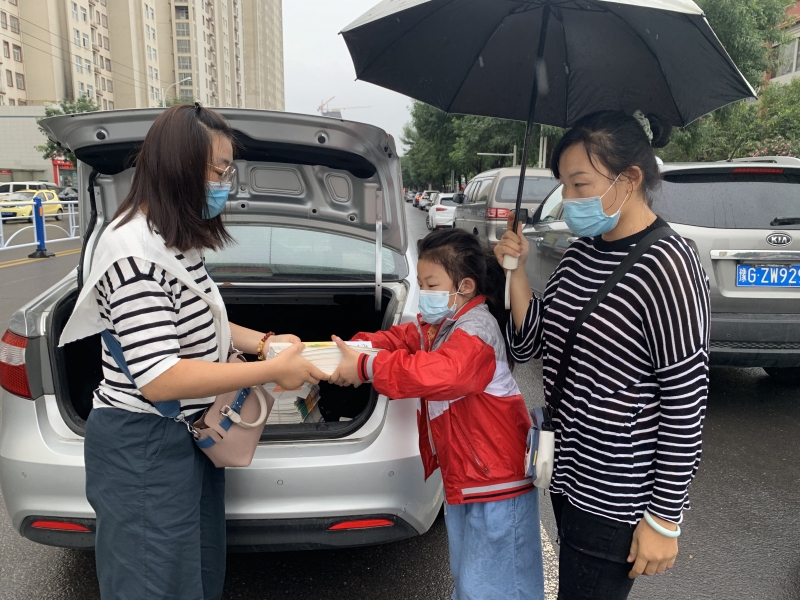 8月29日下午,輝縣市文昌小學班主任侯靜敏和任課教師王莎莎冒雨把新學期教材送到學生手中,為(wei) 9月1日的線上教學做好準備 (通訊員 侯靜敏 攝)