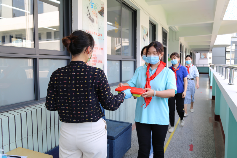 教室門口,班主任對本班學生進行體(ti) 溫測量、消毒工作,第二輔導員填寫(xie) 晨午檢記錄並對學生手部進行消毒。下課鈴響起,班主任、第二輔導員、樓梯值班教師迅速就位,兩(liang) 名輔導員組織學生有序列隊,並引領學生下樓進行大課間活動,提醒學生注意安全,保持距離。