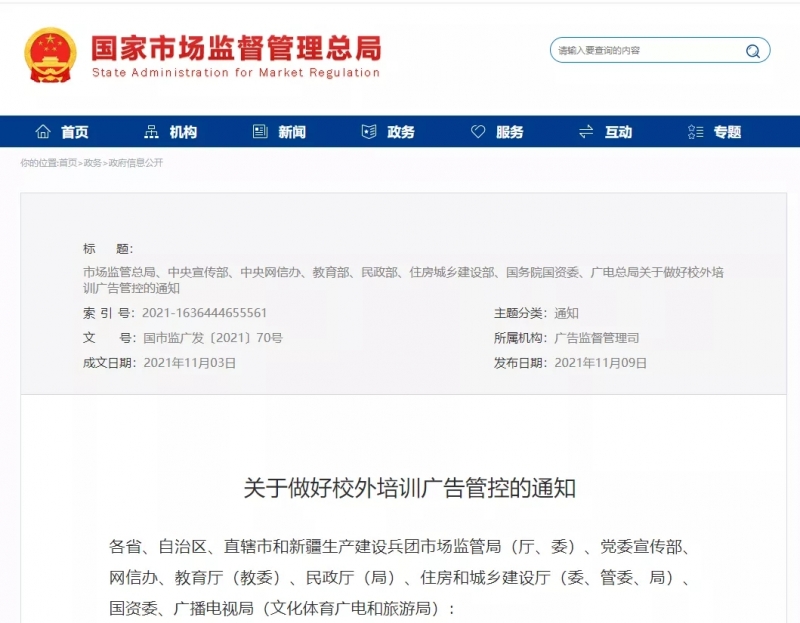為(wei) 進一步落實《關(guan) 於(yu) 進一步減輕義(yi) 務教育階段學生作業(ye) 負擔和校外培訓負擔的意見》有關(guan) 要求,近日,市場監管總局會(hui) 同中宣部、網信辦、教育部、民政部、住建部、國資委、廣電總局等八部門研究出台《關(guan) 於(yu) 做好校外培訓廣告管控的通知》,就做好校外培訓廣告管控工作作出部署。