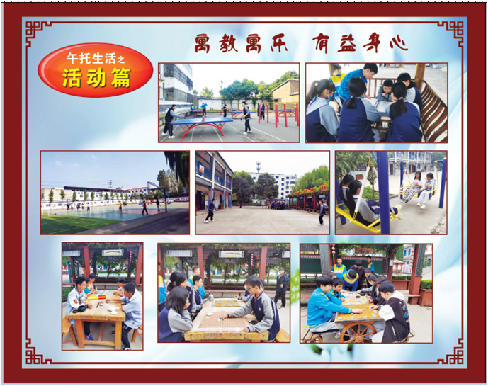 龍門一實校午托服務從(cong) 午間用餐、午間活動、午間休息、午間輔導四方麵紮實推進。為(wei) 了讓學生午餐吃得飽、吃得好。學校自己加工餐食,以降低成本提高飯菜質量,每天中午學校學生餐廳供應四菜一湯及米飯麵食,葷素搭配,飯後配水果,確保學生的營養(yang) 需求。午餐後,學校組織學生分組進行午間活動,學校出資2萬(wan) 餘(yu) 元添置體(ti) 育、健身器材、購買(mai) 圍棋、象棋、跳棋等,讓學生在餐後有30分鍾的活動、遊戲、休閑時間,給學生提供了豐(feng) 富多彩的飯後放鬆活動。