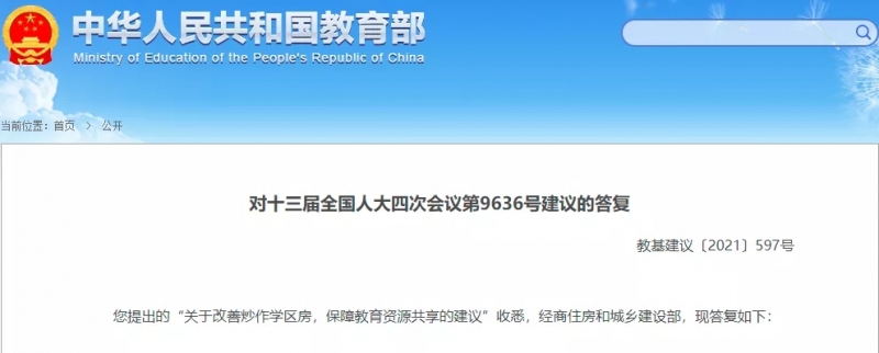 近日,教育部在答複十三屆全國人大四次會(hui) 議第9636號建議“關(guan) 於(yu) 改善炒作學區房,保障教育資源共享的建議”時表示,“學區房”的出現在一定程度上反映了優(you) 質教育資源配置不均衡、校際間辦學質量存在差異的問題。教育部高度重視這一問題,一手推進均衡發展、著力縮小校際差距,一手推進多校劃片、治理擇校和規範招生入學秩序,取得了明顯成效。
