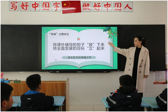 “雙減”是一項基於(yu) 立德樹人目標,促進孩子素質全麵發展的係統性工程。“雙減”政策給學校和學生帶來了巨大變化,政策實施以來,我們(men) 對“雙減”的理解和踐行一直沒有停止。“雙減”既要強化學校教育主陣地,又要做好家校溝通,以及學生心理調適,發揮學校、家庭、社會(hui) 育人的同心圓作用。2021年11月24日,金水區文化綠城小學組織各班開展了關(guan) 於(yu) “雙減”主題班會(hui) 活動。