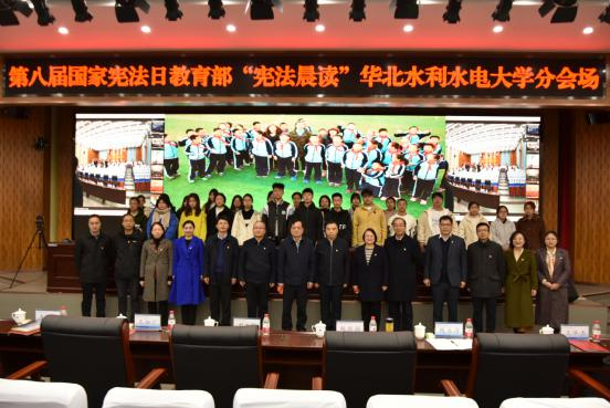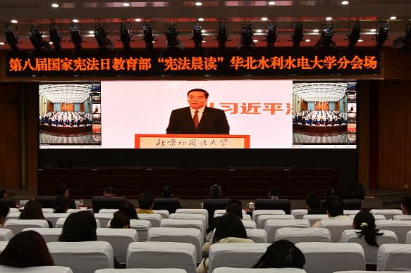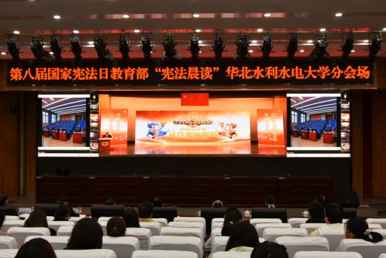 12月3日,為(wei) 迎接第八個(ge) 國家憲法日,深入學習(xi) 貫徹習(xi) 近平法治思想,進一步普及憲法知識、弘揚憲法精神、樹立憲法權威,教育部在北京舉(ju) 辦教育係統“憲法晨讀”活動。活動在全國31個(ge) 省(區、市)和新疆生產(chan) 建設兵團設分會(hui) 場,近30萬(wan) 所學校的8000多萬(wan) 名師生通過網絡連接主會(hui) 場同步參與(yu) 。華北水利水電大學通過網絡在線參與(yu) “憲法晨讀”,校長劉文鍇、紀委書(shu) 記王如廠、社科處處長魏新強、紀律檢查委員會(hui) 綜合室主任韋樂(le) 餘(yu) 、黨(dang) 委宣傳(chuan) 部副部長韓玉潔等領導出席活動。法學院領導班子、各學院師生代表、法治小衛士誌願服務隊隊員參加活動。
