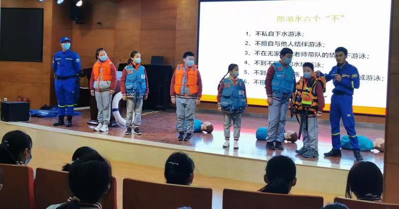 活動中,藍天救援隊隊員向同學們(men) 分享了各類災害現場的救援知識,並手把手教學生正確穿戴救生衣和操作心肺複蘇技能。藍天救援隊隊員們(men) 聞令而動、義(yi) 無反顧地走向救援現場,為(wei) 人民的生命安全保駕護航,其實戰經驗、團結協作精神和專(zhuan) 業(ye) 救援素質,讓同學們(men) 佩服得五體(ti) 投地。楊迪涵在穿上救生衣後說:“通過救援隊叔叔的指導,我學會(hui) 了救生衣的正確穿法,並知道防溺水及自救的許多知識,收獲很多。”丁翊恒說:“通過這次活動,我學到了很多專(zhuan) 業(ye) 急救技能,特別是心肺複蘇,第一次感受了它的神奇。”