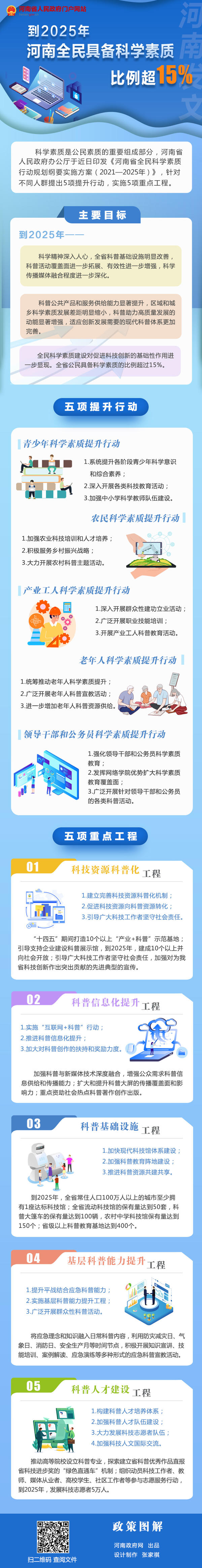 科學素質是公民素質的重要組成部分,河南省人民政府辦公廳於(yu) 近日印發《河南省全民科學素質行動規劃綱要實施方案(2021—2025年)》,針對不同人群提出5項提升行動,實施5項重點工程,到2025年,全省公民具備科學素質的比例超過15%。