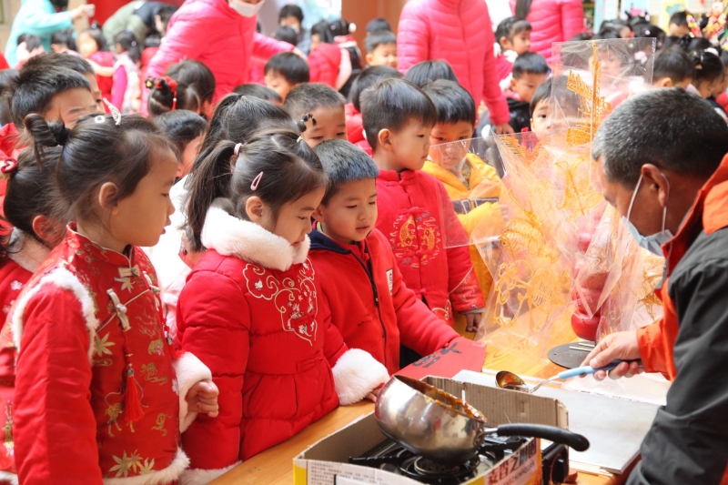 活動現場,皮影戲版的唐宮小姐姐來到孩子們(men) 身邊,光影與(yu) 色彩的碰撞讓經典劇目《武鬆打虎》《金色的魚鉤》煥發新的光彩,老師們(men) 操縱皮影人物,繪聲繪色地講述著精彩故事。在一樓中廳的糖畫、剪紙、捏麵人、烙畫、紙雕等“非遺”互動體(ti) 驗中,孩子們(men) 動手參與(yu) ,在做中學、玩中樂(le) 。南操場鑼鼓喧天,威風凜凜、氣勢磅礴的舞龍舞獅點燃現場,引得孩子們(men) 連連拍手叫好。北操場上,套圈、投壺、扔沙包、騎竹馬、布袋跳……開展形式多樣的民俗遊戲,孩子們(men) 強健體(ti) 魄的同時,加強了對元旦、新年等傳(chuan) 統節日的認知。