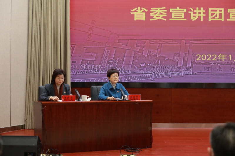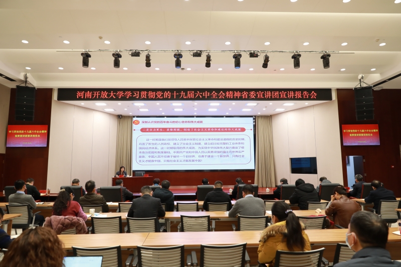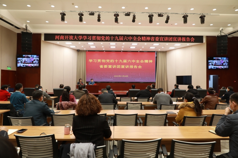 根據河南省委高校工委、kaiyun体育登入口統一安排部署,1月4日,學習(xi) 貫徹黨(dang) 的十九屆六中全會(hui) 精神省委宣講團宣講報告會(hui) 在河南開放大學辦公樓二樓會(hui) 議室舉(ju) 行。省委宣講團成員、河南職業(ye) 技術學院黨(dang) 委書(shu) 記李桂貞作專(zhuan) 題宣講報告。kaiyun体育登入口思想政治工作處處長陳凱、全體(ti) 校領導出席報告會(hui) ,學校各部門主要負責人、馬克思主義(yi) 學院全體(ti) 教師現場聆聽宣講報告,全省電大係統以網絡視頻形式參會(hui) 學習(xi) 。報告會(hui) 由河南開放大學黨(dang) 委書(shu) 記、校長趙繼紅主持。