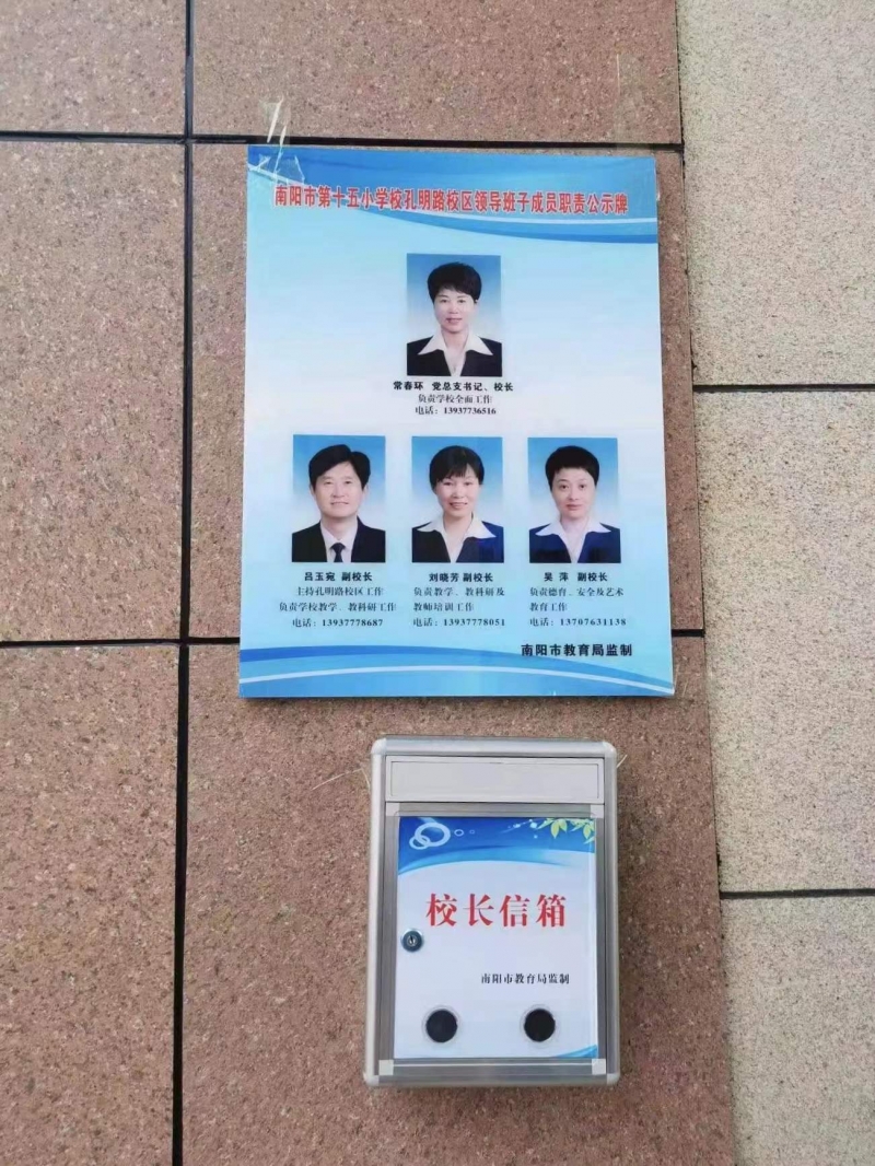 1月12日,記者從(cong) 南陽市教育局獲悉,為(wei) 全麵優(you) 化教育營商環境,接受社會(hui) 監督,聽取家長師生意見,及時解決(jue) 問題矛盾,提高學校管理能力和服務水平,市教育局要求局屬各學校在校門口醒目位置懸掛校長(園長)職責公示牌和校長(園長)信箱。