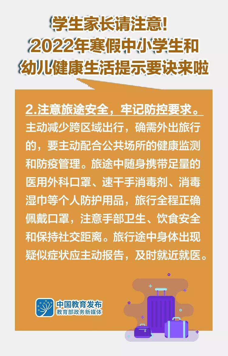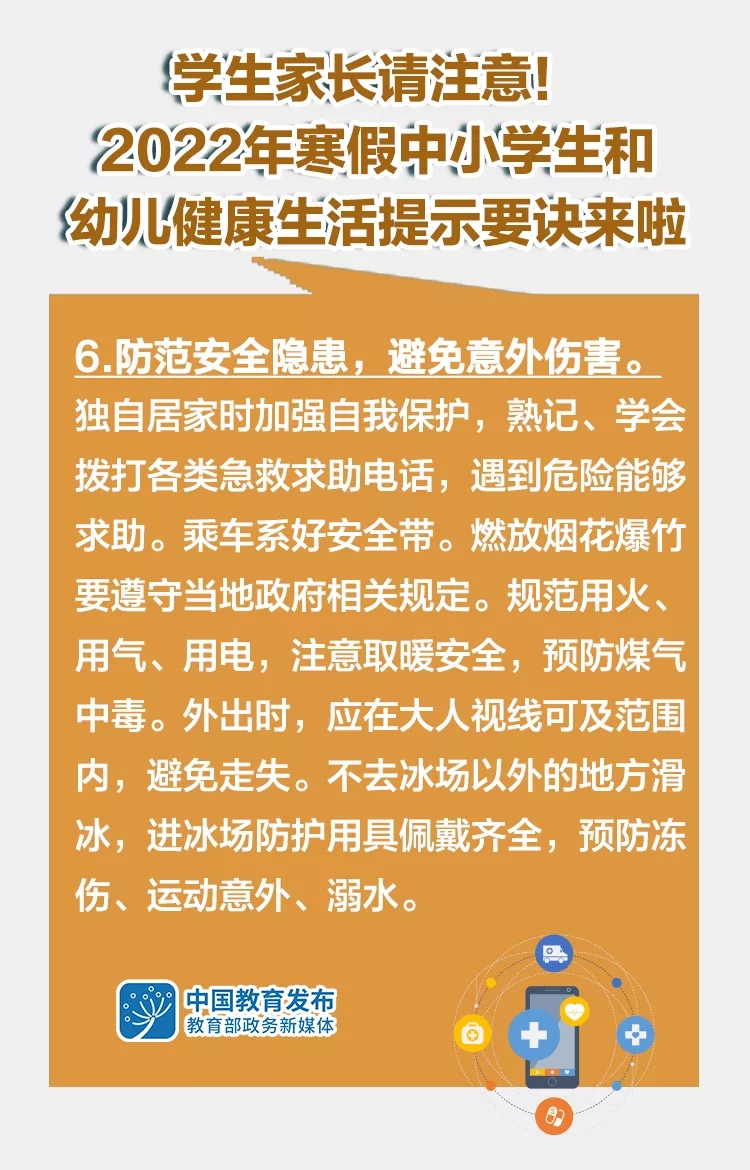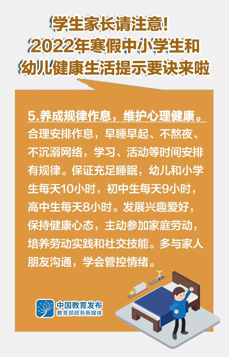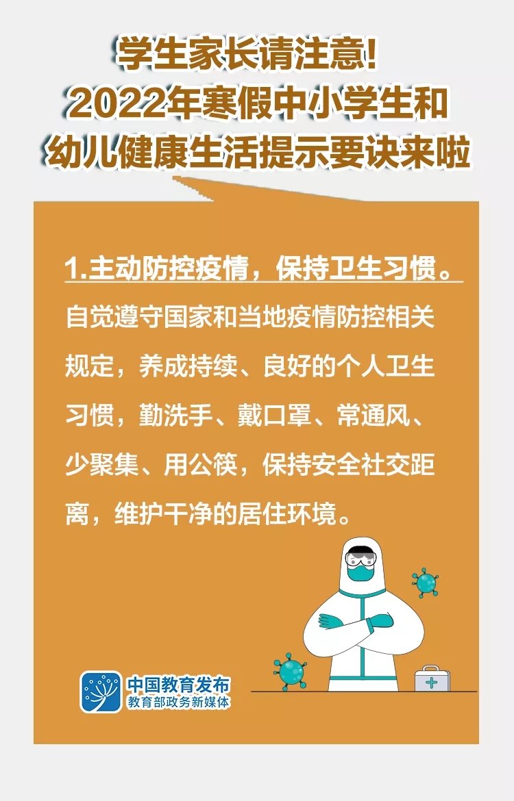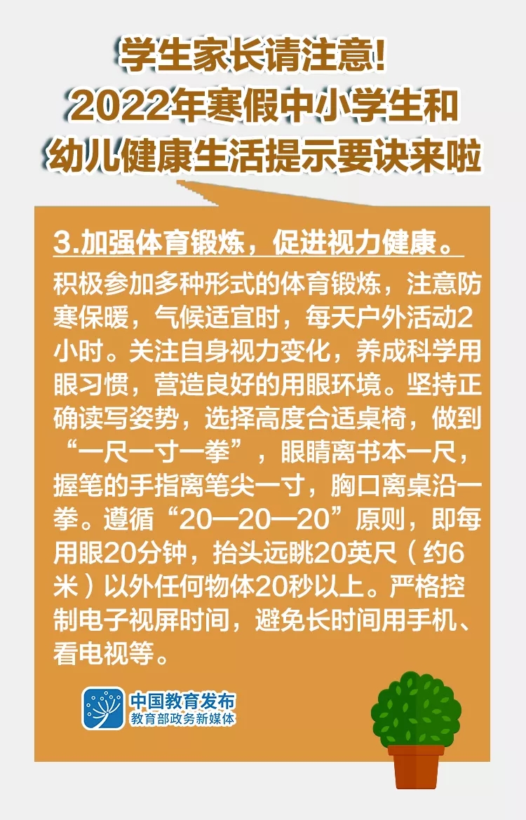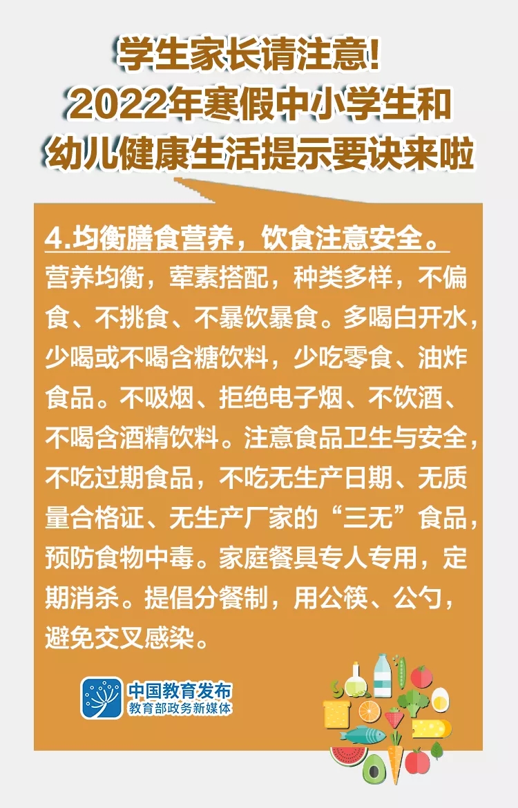 近日,教育部指導全國中小學健康教育教學指導委員會(hui) 專(zhuan) 家,提出2022年寒假中小學生和幼兒(er) 健康生活提示要訣,引導中小學生和幼兒(er) 加強體(ti) 育鍛煉,合理安排假期生活和學習(xi) ,均衡膳食營養(yang) ,養(yang) 成健康生活方式,做自己健康的第一責任人。一起來看這組大圖——