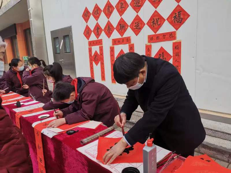 老師和同學們(men) 一起精心布置場地,擺好桌子,準備筆墨紙硯,小心翼翼地摁紙、拉平,在紅色紙張上潑墨揮毫。同學們(men) 字體(ti) 雋秀、筆法嫻熟,風格迥異的行、隸、草、楷、篆等各種字體(ti) 盡顯神韻,或秀美遒勁,或瀟灑飄逸,飽含真情,寓意吉祥。校長楊關(guan) 群也參與(yu) 到書(shu) 寫(xie) 活動中,為(wei) 大家帶來節日的祝福。