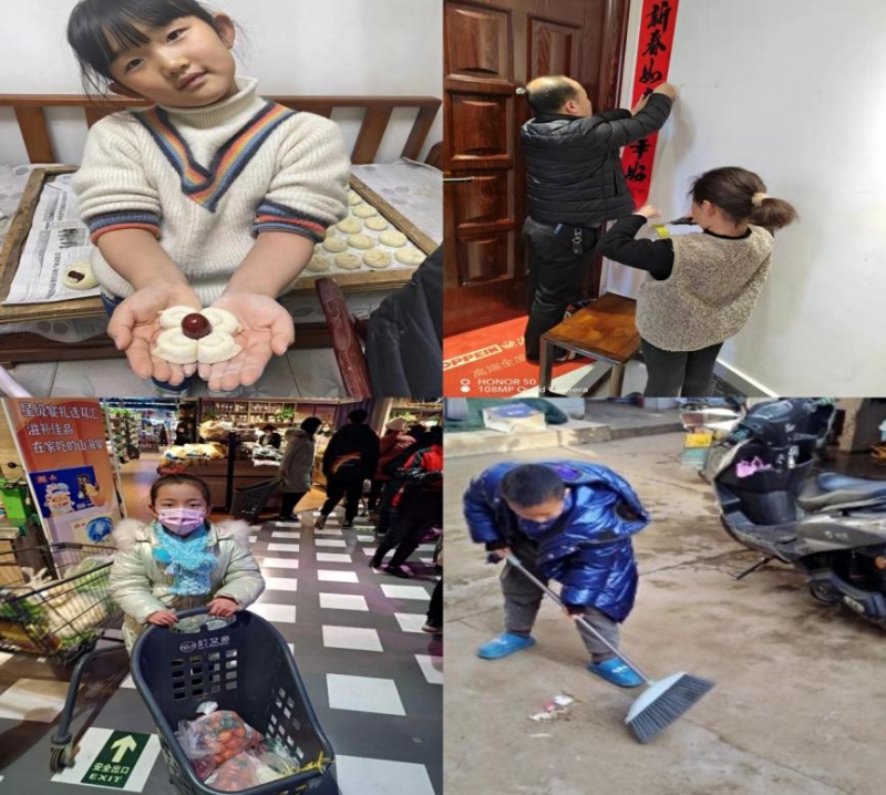 自己的事情自己做,家裏的事情幫著做,傳(chuan) 承優(you) 良家風。要求孩子們(men) 和家人一起購買(mai) 年貨、大掃除、掛燈籠、貼福字……把家裏裝飾一番,紅紅火火過新年。和爸爸爸媽媽一起做年夜飯,學做一道家常菜,在做的過程中了解各種美食的來曆,品味其深意。做一些洗碗、洗衣、掃地、擦桌子、倒垃圾等力所能及的家務,養(yang) 成愛勞動的好習(xi) 慣。