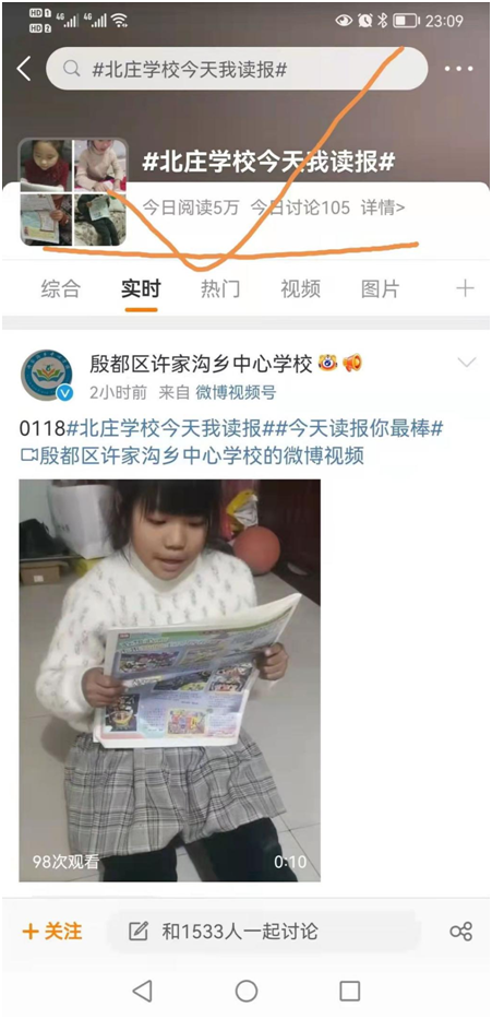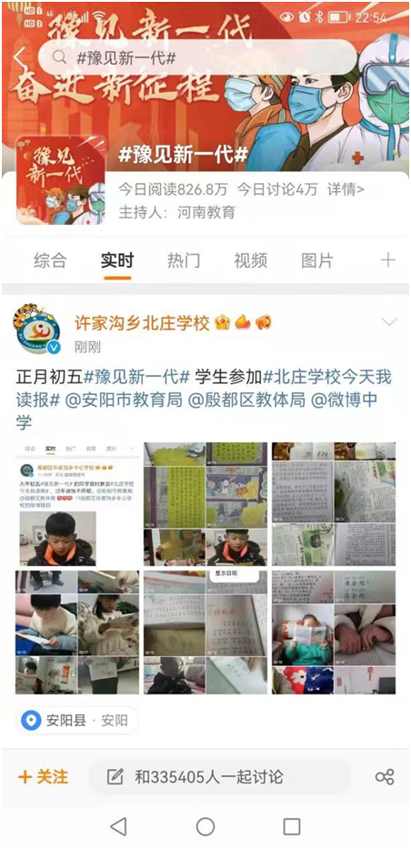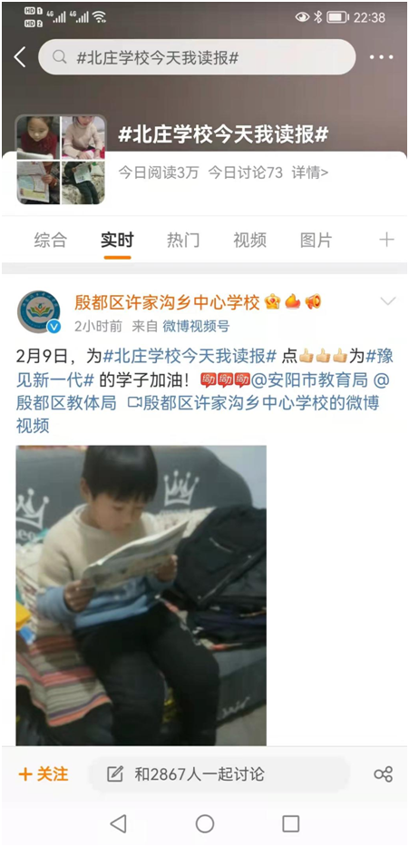 安陽市殷都區許家溝鄉(xiang) 北莊學校的孩子們(men) 認識《小學生學習(xi) 報》半年有餘(yu) ,每次領到新報紙,大家都愛不釋手,每天堅持參加“#北莊學校今天我讀報#” 活動,現已累計閱讀196.7萬(wan) 人次,共同參與(yu) 討論4300人次--手中的報紙讀了一遍又一遍,有的甚至都被翻破了,但大家還是不舍得放下,從(cong) 開始不認識上麵的個(ge) 別生字,到現在有的段落就能背誦下來,這是一份什麽(me) 樣喜歡和執著啊!特別是在疫情期間,孩子們(men) 堅持宅在家裏讀報不亂(luan) 跑 ,用自己的方式為(wei) 抗擊疫情做貢獻;雖然大家宅在家裏的日子很長,但是有了《小學生學習(xi) 報》的陪伴,孩子們(men) 又感覺到時間過的很快、生活過得很充實。期間,老師不怕勞累,每天為(wei) 孩子們(men) 點讚,許多孩子被評為(wei) “#今天讀報你最棒#好學生”。冬去春來,終於(yu) 開學了,大家情不自禁地在期盼:“我的新報紙什麽(me) 時間送來?”哈哈……