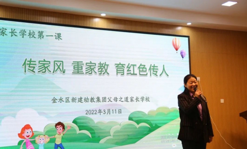 家庭教育是一切教育的原始與(yu) 基礎。為(wei) 喜迎黨(dang) 的二十大勝利召開,貫徹《家庭教育促進法》,2022年3月11日上午,鄭州市金水區新建幼教集團特邀全國家庭教育工作先進個(ge) 人、河南省家庭教育講師團首批專(zhuan) 家、鄭州市關(guan) 工委副主任、鄭州市教育局關(guan) 工委關(guan) 愛工作專(zhuan) 家團團長周慧玲老師開展“傳(chuan) 家風 重家教 育紅色傳(chuan) 人”專(zhuan) 題講座,受疫情影響,新建幼兒(er) 園控製線下活動規模,隻邀請46名家長代表到本園報告廳參與(yu) 活動,其他近600名家長通過釘釘直播聆聽講座,金水區教育局、金水區關(guan) 工委相關(guan) 科室負責人出席了本次活動。