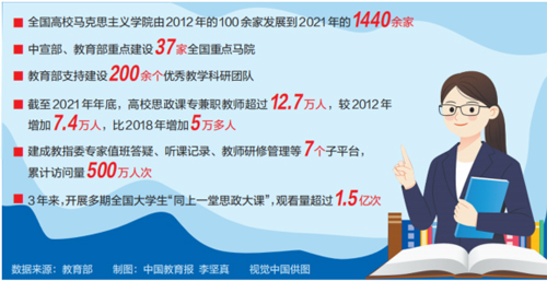 3年來,教育部和各地各校牢記習(xi) 近平總書(shu) 記囑托,聚焦鑄魂育人,加強黨(dang) 對思政課建設的全麵領導,形成合力辦好思政課的工作格局,著力構建思政金課體(ti) 係,不斷完善“三全育人”工作體(ti) 係。