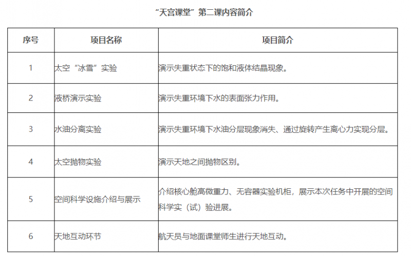本次太空授課活動繼續采取天地對話方式進行,由航天員在軌演示太空“冰雪”實驗、液橋演示實驗、水油分離實驗、太空拋物實驗,介紹與(yu) 展示空間科學設施(授課內(nei) 容介紹附後),旨在傳(chuan) 播普及空間科學知識,激發廣大青少年不斷追尋“科學夢”、實現“航天夢”的熱情。