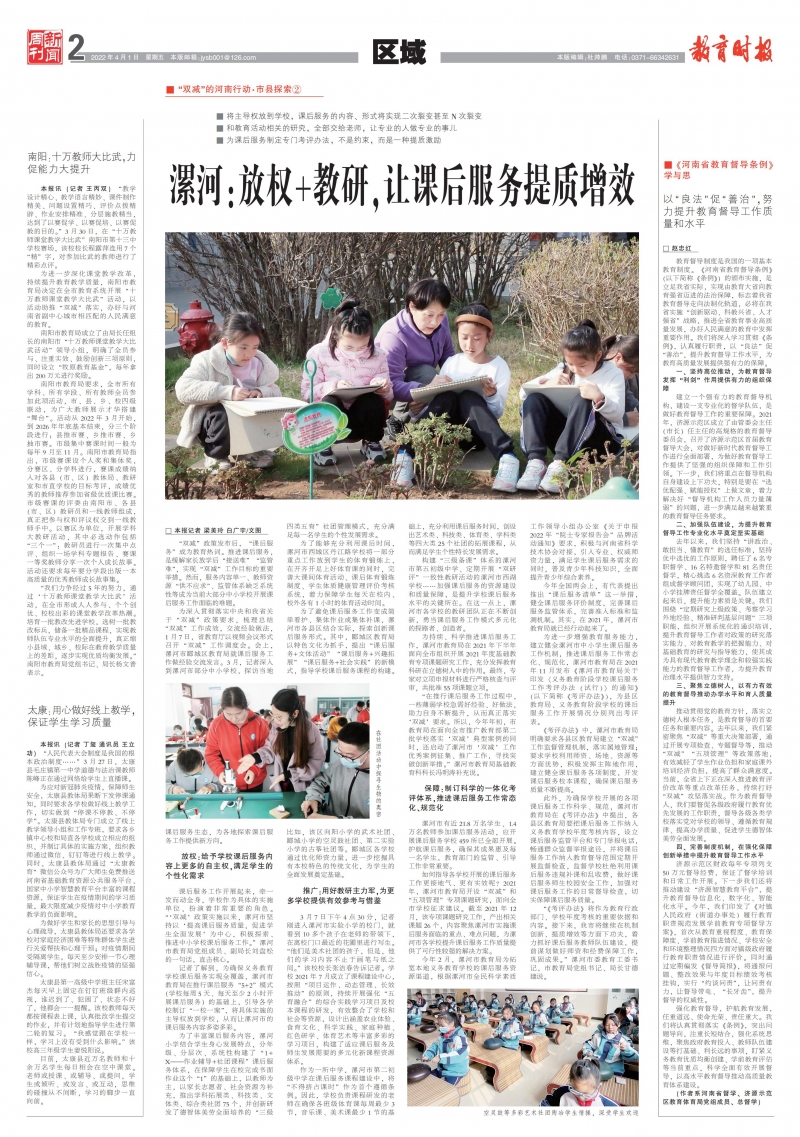 推動貫徹黨(dang) 的教育方針,落實立德樹人根本任務,是教育督導的首要任務和重要內(nei) 容。去年以來,我們(men) 緊密聚焦“雙減”等重大決(jue) 策部署,通過開展專(zhuan) 項檢查、專(zhuan) 題督導等,推動“雙減”“五項管理”等政策落地,有效減輕了學生作業(ye) 負擔和家庭課外培訓經濟負擔,提高了群眾(zhong) 滿意度。當前,全省上下正在深入推進教育評價(jia) 改革等重點改革任務,持續打好“雙減”攻堅落實戰。作為(wei) 教育督導人,我們(men) 要督促各級政府履行教育優(you) 先發展的工作職責,督導各級各類學校落實黨(dang) 對學校的領導、遵循教育規律、提高辦學質量、促進學生德智體(ti) 美勞全麵發展。