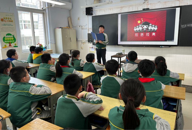 在少先隊活動課中,各年級開展豐(feng) 富多彩的活動。一至三年級學生在中隊輔導員的帶領下觀看紅色電影。“一寸山河一寸血,一抔熱土一抔魂。”學生聽得認真、看得專(zhuan) 注。一次次的隊前教育,讓同學們(men) 用更高的標準和要求向少先隊靠攏,用實際行動早日成為(wei) 一名光榮的少先隊員,扣好人生第一粒扣子。