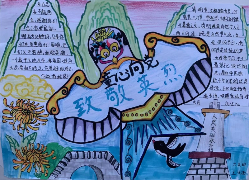 六年級中隊長通過一張張鮮活的照片、一個(ge) 個(ge) 革命英烈的故事,仿佛把全班同學帶回了曾經奮戰的曆史年代。隊員們(men) 有感而發,通過一張張精美的手抄報記錄著、追憶著……