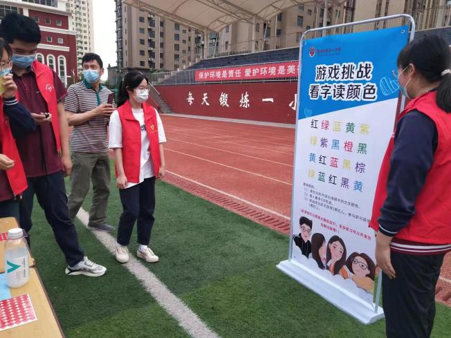 下午五點,第一批學生率先到達操場。在簽到後領取遊戲通關(guan) 卡,穿過展示區到達挑戰區。挑戰區共設置了看字讀顏色、遊泳的乒乓球、手腳並用、翻數字、心想事成和趣味競答6個(ge) 遊戲關(guan) 卡。每挑戰一項遊戲即可獲得對應的心形貼紙。集齊10枚即可兌(dui) 換獲得體(ti) 驗區的手工製作材料,體(ti) 會(hui) 藝術創作帶來的放鬆與(yu) 愉悅。