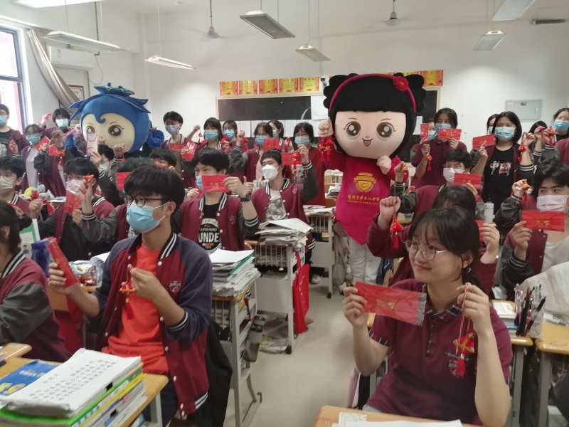校領導身穿吉祥物玩偶服,為(wei) 同學們(men) 送上印有“金榜題名”的定製口罩和香囊