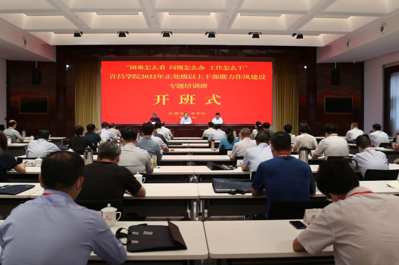 許昌學院2022年正處級以上幹部能力作風建設專(zhuan) 題培訓班在紅旗渠幹部學院舉(ju) 辦,7月12日上午,培訓班正式開班。紅旗渠幹部學院副院長石瑞峰,許昌學院黨(dang) 委書(shu) 記郭濤,黨(dang) 委副書(shu) 記、校長嶽修峰,黨(dang) 委副書(shu) 記孫海,副校長崔斌、潘春彩,紀委書(shu) 記王東(dong) 曉出席開班儀(yi) 式。全校正處級領導幹部參加開班儀(yi) 式。儀(yi) 式由嶽修峰主持。