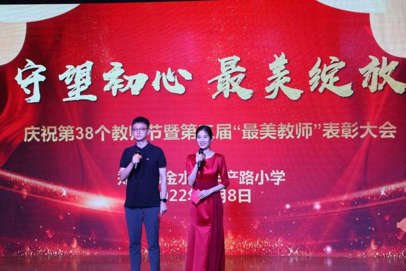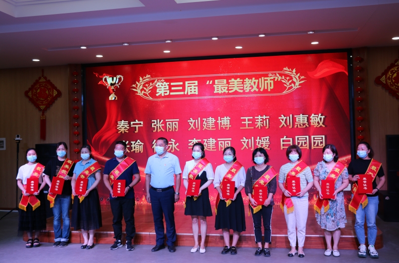 “愛崗敬業(ye) ,以身作則,他們(men) 的班級工作開展得有聲有色;無私奉獻,以愛為(wei) 橋,他們(men) 贏得了學生和家長的信任與(yu) 愛戴……!”伴隨著“最美教師”頒獎詞,經過民主評選出來的10位“最美教師”身披紅色綬帶,依次上台接受表彰。金水區豐(feng) 產(chan) 路小學黨(dang) 支部書(shu) 記、校長陳鵬為(wei) 他們(men) 頒發了榮譽證書(shu) ,並留下了珍貴的合影。