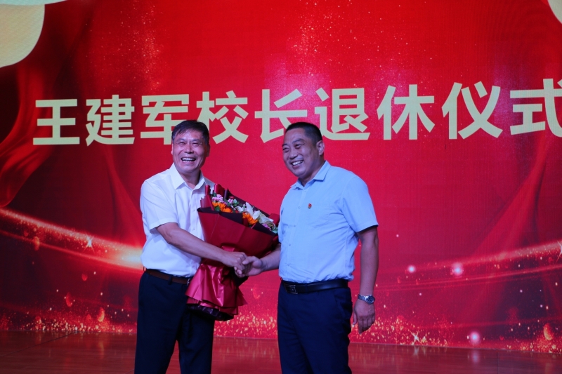 此次大會(hui) 除了有表彰,還有歡送。王建軍(jun) 校長在教育戰線勤懇工作了幾十年,如今就要光榮退休了。金水區豐(feng) 產(chan) 路小學也利用此次大會(hui) 為(wei) 他舉(ju) 行了隆重的退休儀(yi) 式。黨(dang) 支部書(shu) 記、校長陳鵬為(wei) 他送上了鮮花,並頒發了退休證。老師們(men) 內(nei) 心戀戀不舍與(yu) 滿懷崇敬的心情,都飽含在熱烈而持久的掌聲之中。