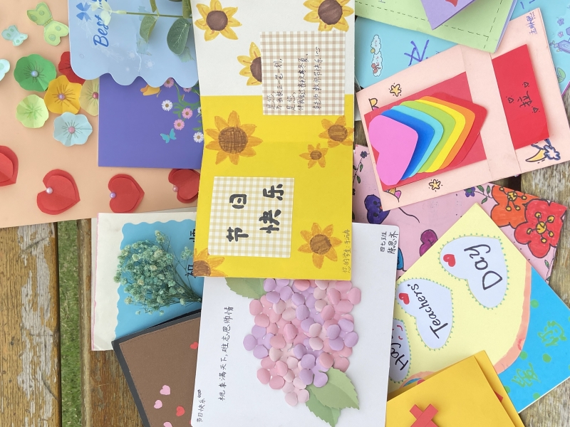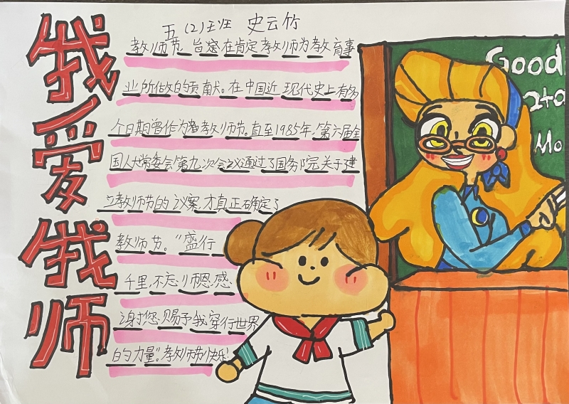 一至三年級同學製作手工笑臉卡;四年級同學製作“感念師恩”主題敬師卡;五年級同學繪製“我愛我師”主題手抄報;六年級同學獻上以“心中最美的老師”為(wei) 主題的小作文……千千萬(wan) 萬(wan) 的祝福化作一個(ge) 個(ge) 標準的隊禮、一張張精美的賀卡、一份份整潔的作業(ye) 、一張張繽紛的手抄報,帶給老師無限的欣喜與(yu) 溫暖……