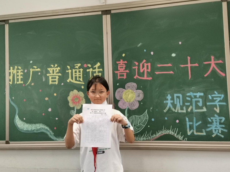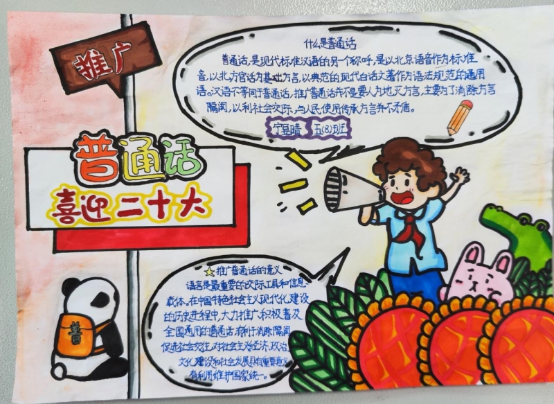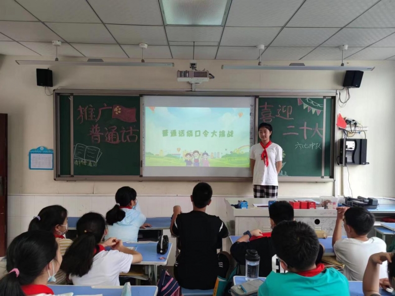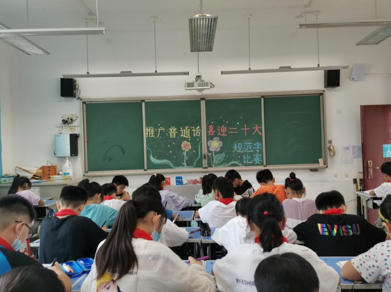 各班以“推廣普通話,喜迎二十大”為(wei) 主題舉(ju) 行班會(hui) 。在班會(hui) 上,同學們(men) 以演講、詩歌誦讀等形式展現我國語言文字的魅力,使規範使用祖國語言文字和傳(chuan) 承中華優(you) 秀文化意識深入師生心靈。五、六年級開展經典詩歌誦讀活動,各班利用早讀時間開展經典誦讀,並評選出“誦讀之星”。一、二年級開展普通話進家庭活動,每個(ge) 學生在家裏教父母說普通話,與(yu) 父母共同體(ti) 會(hui) 說普通話的意義(yi) 。