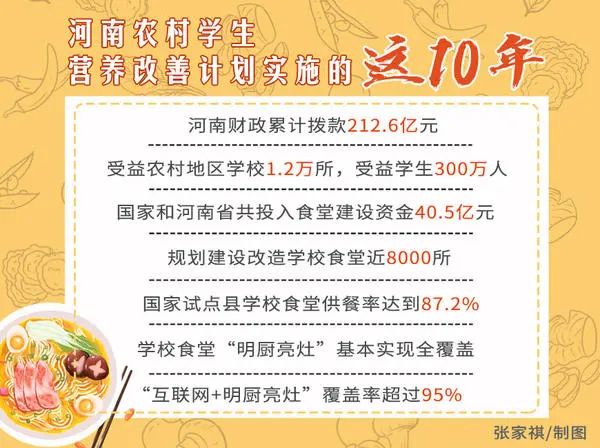 2022年,河南省農(nong) 村義(yi) 務教育學生營養(yang) 改善計劃實施滿10年。河南有關(guan) 部門近日發布的一組數據顯示:這10年,我省累計撥款212.6億(yi) 元,受益農(nong) 村地區學校1.2萬(wan) 所,受益學生300萬(wan) 人,我省規劃建設改造學校食堂近8000所,規劃建設學校食堂5187所……河南先後采取一係列有效措施,讓河南農(nong) 村學生營養(yang) 餐不斷提質,從(cong) “吃得飽”走向“吃得好”。