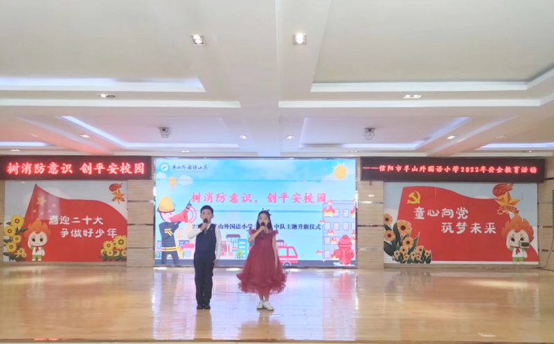 2022年11月7日早8:00,沐浴著暖意融融的陽光,信陽市羊山外國語小學以“樹消防意識,創平安校園”為(wei) 主題,開展了線上主題升旗儀(yi) 式。本次活動由三(8)中隊承辦。本次活動由魏世語和戴小茹兩(liang) 位同學主持。